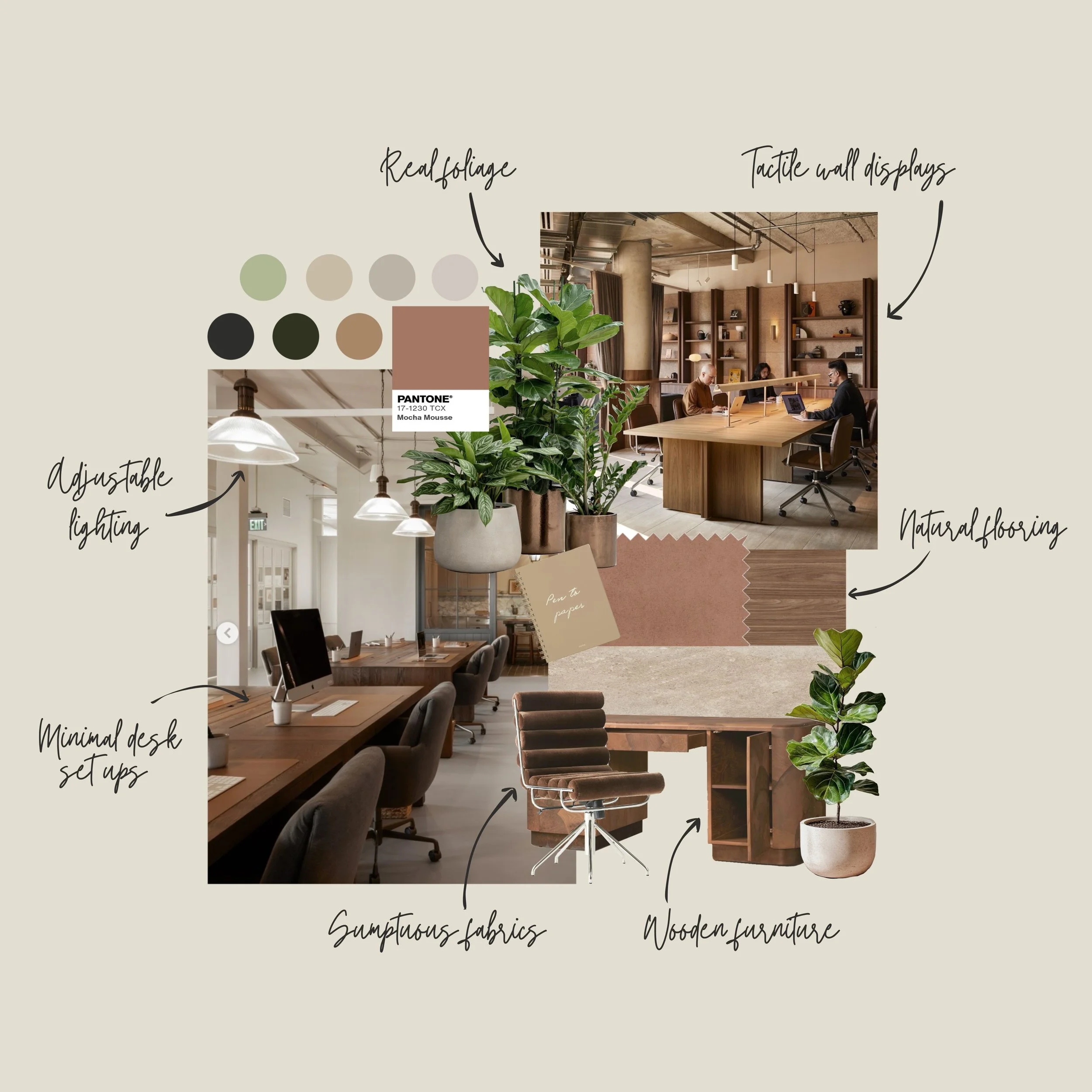Drawing inspiration from Pantone’s Colour of the Year, Mocha Mousse, I began by exploring how this particular tone of brown can influence mood within a workspace. As a soft neutral, it naturally elicits a sense of calm, grounding us through its deep association with the earth. This connection ties directly into principles of biophilic design, bringing elements of nature indoors to support wellbeing and foster a sense of balance.