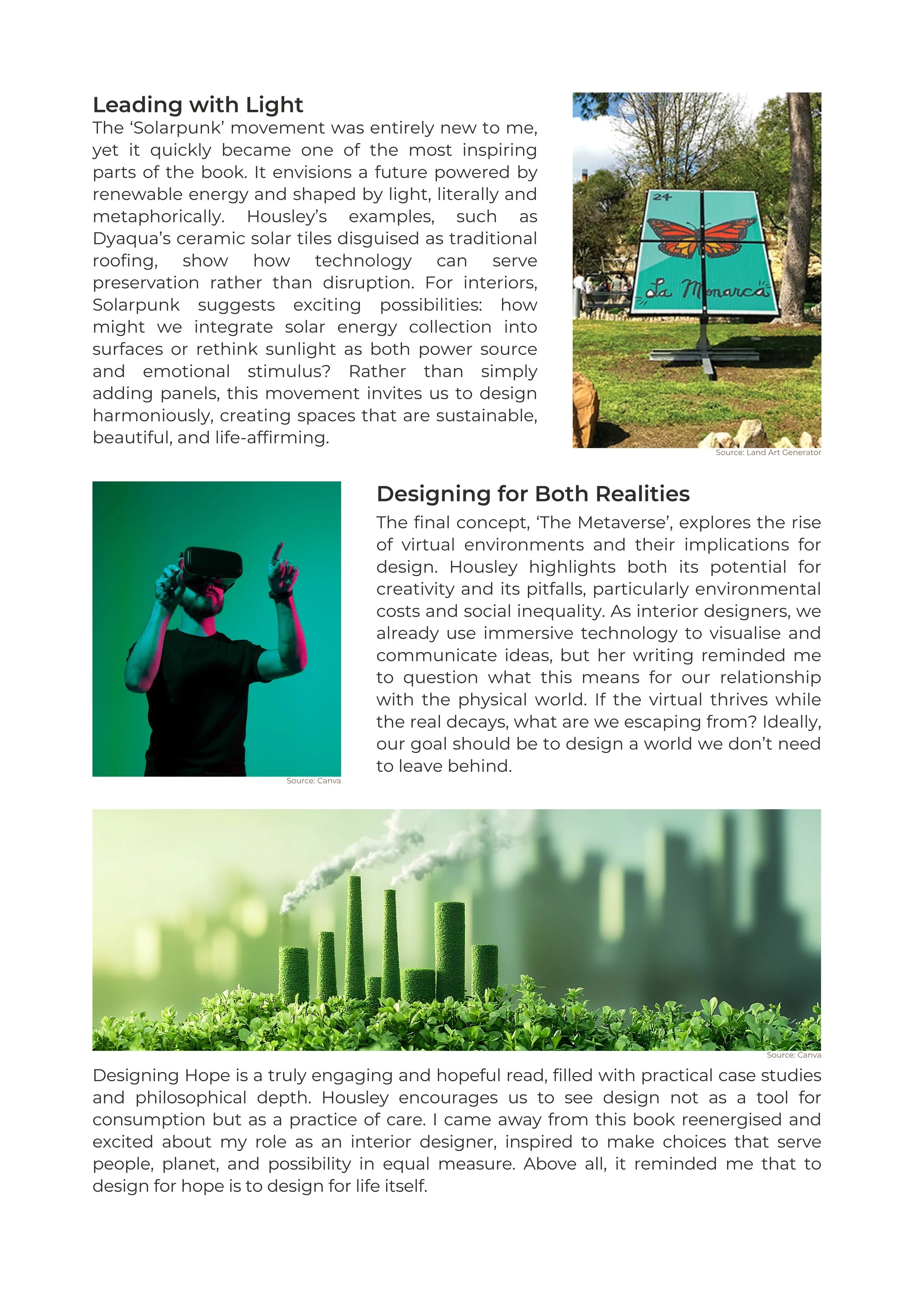 I came across Sarah Housely’s book, Designing Hope, through a LinkedIn post and had to buy it immediately. As an interior designer, I’m always interested in how emerging trends can inform and inspire my work, and this book offered just that. Designing Hope showcases a series of compelling case studies that sparked extensive research on my par, resulting in nearly 20 pages of notes I plan to reference in future projects. Condensing such rich content into a short article was a challenge, but I highly recommend picking up a copy yourself to fully appreciate the insights Sarah shares.
