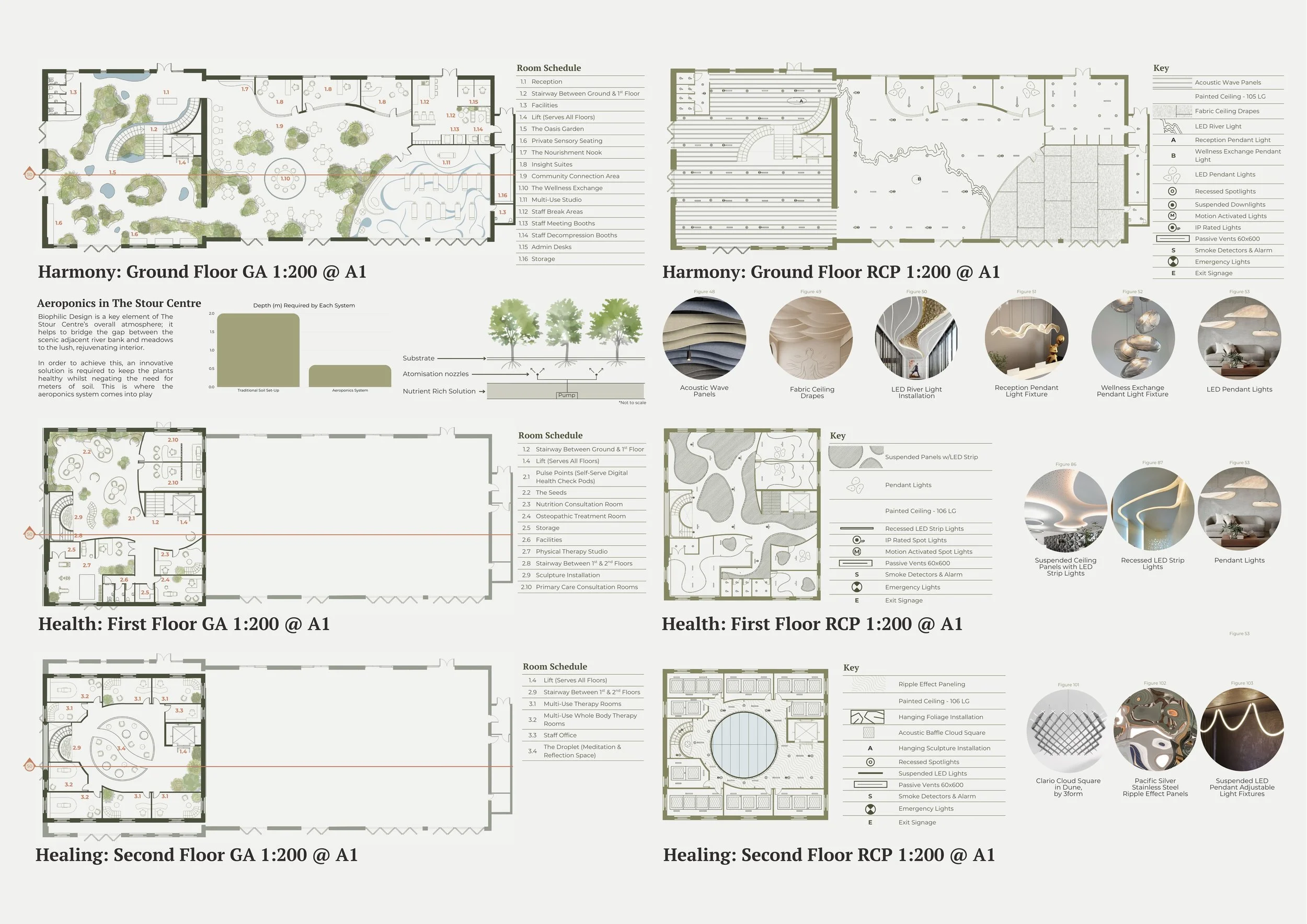 Alongside the plans, a focused section introduces the integration of aeroponic systems within the design. These innovative installations support the growth of trees indoors, reinforcing the project’s vision of health, sustainability, and future-forward wellbeing in communal spaces.